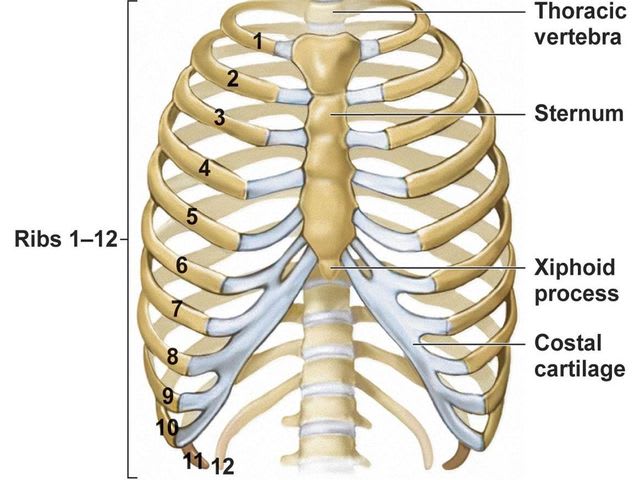 Feb 17, 2020 · The Anatomy Of The Human Ribs Is Made Up Of 24 Ribs Which Are Parted In 12 Pairs (Each On The Left And Right Side Of The Chest Wall), With The Sternum, Metasternum (The Xiphoid Process), And The Costal Cartilages All Situated At The Anterior Of The Chest Wall, Followed By The Thoracic Vertebrae On The Posterior Of The Chest Wall.